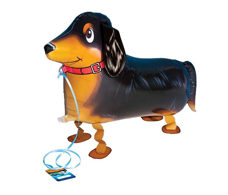Mäyräkoiran mallinen muotofoliopallo, jonka jalkoihin kiinnitetyt painot pitävät pallon maassa. Voit leikkiä sen kanssa ja taluttaa hihnassa kuten oikeaa koiraa!