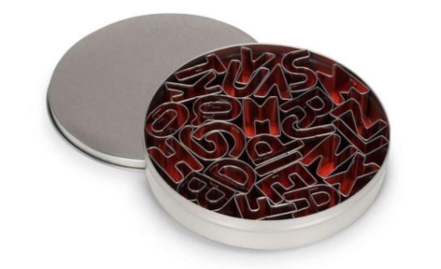 Pakkaus sisältää 26 kpl pieniä kirjainmuotteja, muotit A-Z. Muotit ovat metallirasiassa jossa ne on kätevä säilyttää.