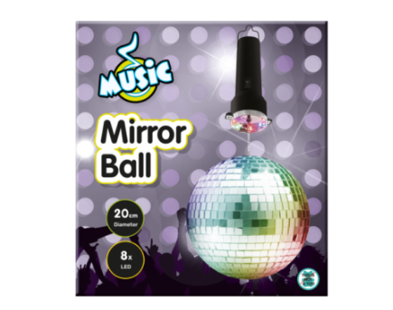 20 cm peilipallolla luot hienon diskotunnelman. Ripusta pallo kattokoukkuun, anna pallon pyöriä ja värivalojen loistaa. Sisältää 8 led-valoa. Toimii 4 x AA paristoilla. Vain sisäkäyttöön.