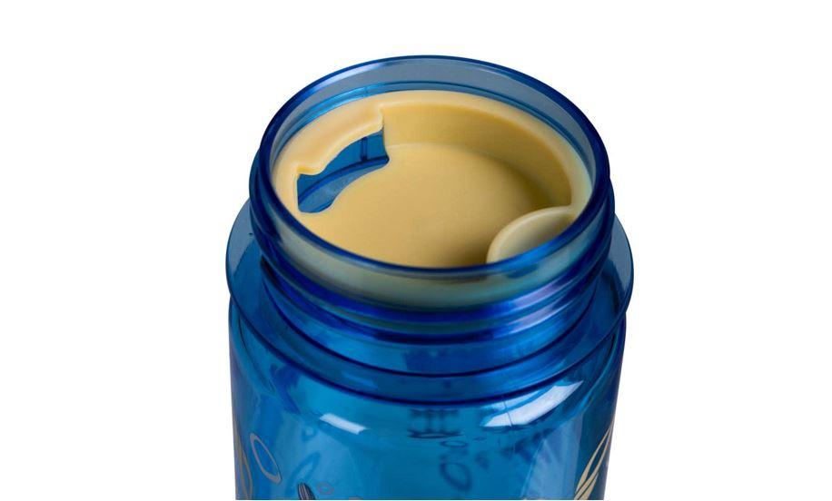 Sinisessä pullossa on hyväntuulinen Rantaleikki-printti, jossa Muumit nauttivat kesäpäivästä rannalla retkeillen ja leikkien. Pullon sisällä on kätevä välikappale, joka tekee juomisesta helpompaa myös pienimmille lapsille. Vain käsinpesu.