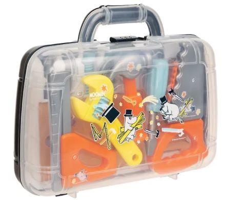 Kätevässä muovisessa salkussa on kaikki pienen timpurin tarvitsemat työkalut samassa paketissa. Salkku sisältää sahan, ruuvimeisselin, vasaran, mitan ja jakoavaimen. Toisessa kerroksessa on vielä rei’itetty puupenkki, sekä ruuveja ja muttereita. Työkalut ovat kestäviä ja pieneen käteen sopivia. Työkaluihin ja salkun kanteen on painettu erilaisten rakentelupuuhien parissa touhuileva Muumipappa.