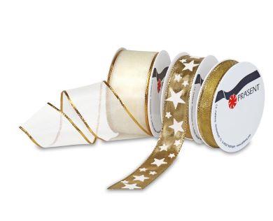 Organzanauha kultatähdillä, luonnonvalkoinen