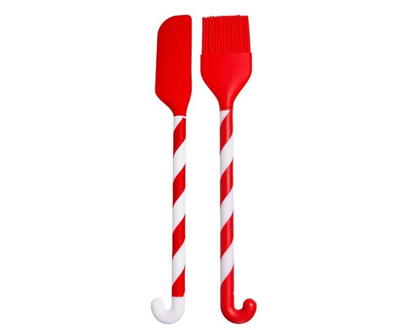 Jouluisen punavalkoraidallinen leivontavälinesetti, joka sisältää korkealaatuisesta silikonista ja PP-muovista valmistetut nuolijan ja pullasudin. Kestävät ja laadukkaat välineet kestävät konepesun ja ne on helppo puhdistaa. Täydellinen lahja, sopii sellaisenaan vaikka pikkujoulupaketiksikin.