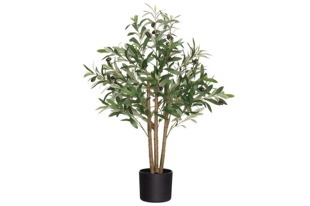 Luonnollisen näköinen oliivipuu -tekokasvi mustassa muoviruukussa. Tekokasveilla on helppo somistaa erilaiset kodin sisätilat, loma-asunnot sekä parvekkeet ja terassit. Korkeus 90 cm.