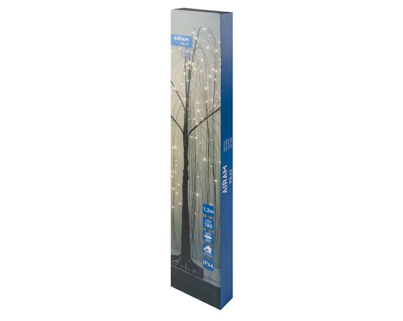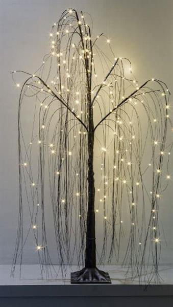 Kaunis 1,2m, musta koristepuu, jonka oksilta riippuvat pitkät led-valo-langat.