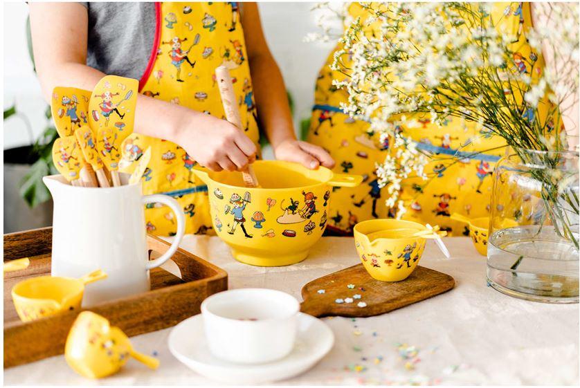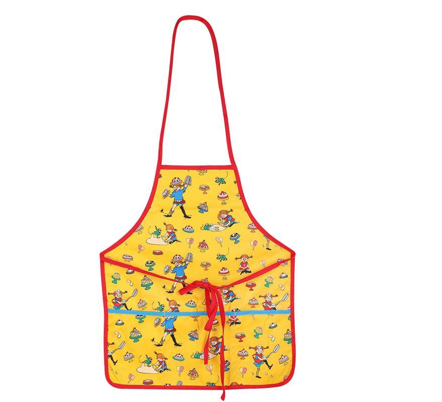 Aurinkoisen keltainen lasten kangasessu, joka on kauniisti leikattu ja viimeistelty. Puuvillaisen esiliinan kuosissa on riemukas Peppi-kuvitus. Kokonaisuus tuo iloa, riemua ja peppimäistä asennetta keittiöön.