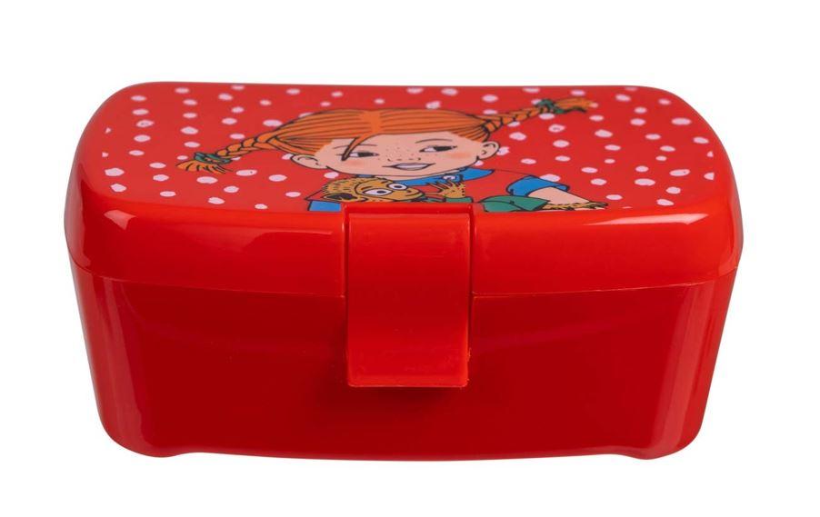 Punainen Peppi Pitkätossu -eväsrasia, jossa on hauska kuvitus Peppi Pitkätossusta ja herra Tossavaisesta ja valkoisia pilkkuja. Eväsrasian mitat ovat 16,5 x 6,5 x 11,5 cm, ja sisällä on jakaja jonka avulla eväät voi jakaa kahteen eri osaan. Eväsrasia on valmistettu BPA-vapaasta PP-muovista.