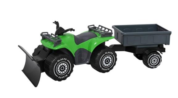 Plaston mönkijä auralla ja peräkärryllä kestää leikistä toiseen. Pituus 52 cm. Valmistettu Suomessa. Ikäsuositus 1+.