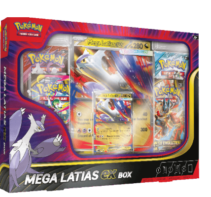 Mega Latias ex Box sisältää Mega Latias ex -promokortin sekä jättikortin. Lisäksi 4 Pokémon boosteria.
