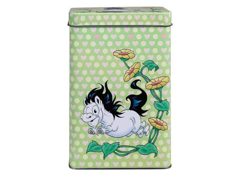 Kaunis vaaleanvihreäpohjainen peltinen kahvipurkki, jonka kannen saa painettua helposti kiinni. Peltipurkin kuosissa Polle-hevonen ja hänen ystävänsä viettävät ihastuttavaa päivää aurinkokukkien keskellä. Käsinpesu ja huolellinen kuivaus.