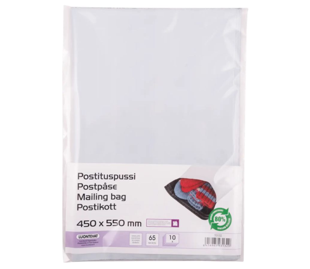 Postituspussi on helppo ja kätevä tapa esimerkiksi vaatteiden tai jalkineiden lähettämiseen. Postituspussin koko 450×550 mm. Läppä 50 mm, jossa pysyvä tarrasuljenta. Pakkauksessa 10 kpl. Valmistusmateriaalin monikerroksinen 65 mikronin LDPE-muovikalvo on ulkopinnalta valkoinen ja sisus musta. Läpinäkymätön muovikalvo suojaa mekaanisilta vaurioilta ja huonoilta sääolosuhteilta. Postituspussi on valmistettu 80% kierrätysmateriaalista ja se on kierrätettävissä muovi- tai energiajätteenä käytön jälkeen.