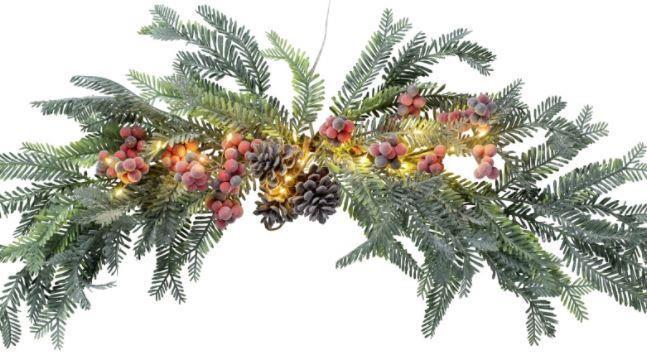 Lämpimän valkoinen led-havukoriste, jossa käpyjä ja marjakoristeita. Ledit eivät ole vaihdettavia. Pakkaus sisältää 3 x AA -paristot ja 6 tunnin ajastimen. Materiaali on muovia. Johto on kirkas.