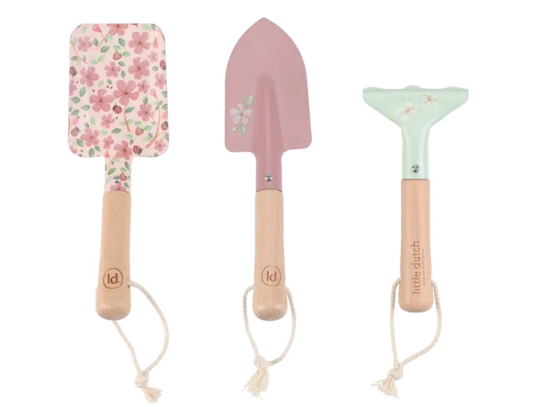 Täydellinen puutarhatyökalusarja pienille puutarhureille. Setti sisältää kaksi metallista lapiota ja haravan, joissa tukevat puiset kahvat. Kätevien nauhojen ansiosta työkalut on helppo ripustaa säilytykseen puutarhanhoidon jälkeen. Ikäsuositus 4+