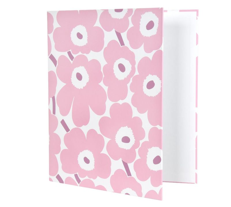 A4 kokoinen ja 4 cm paksu rengaskansio, jossa on Marimekko Unikko kuviointi.