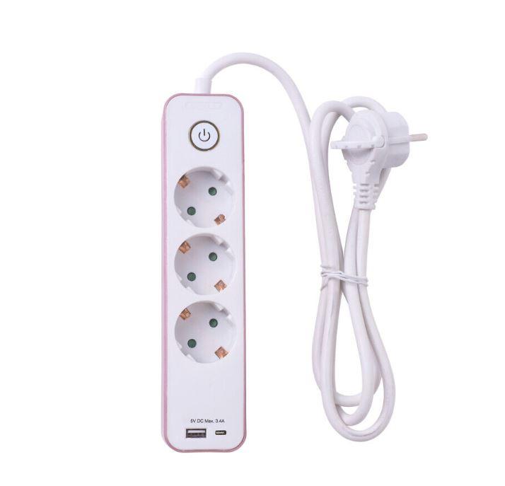 3-osainen jatkojohto, jossa vaaleanpunainen kuori ja on/off-kytkin, tupla USB 2,1A. Litteä pistotulppa, jonka ansiosta jatkojohdon voi helposti sijoittaa ahtaassa paikassa olevaan pistorasiaan, kuten huonekalun taakse.