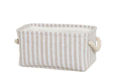 Pystyraidallinen säilytyskori, jossa on köysikahvat. Hillityn tyylikäs Seaside-säilytyskori henkii merellisyyttä, erinomainen valinta niin kotiin kuin mökillekin. Väri beige-valkoinen. Materiaalit: päällinen ja vuori: 40 % polyesteri, 30 % puuvilla, 30 % pellava, kahvat: 60 % polyesteri, 40 % puuvilla. Pintapesu kostealla liinalla.