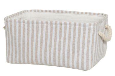 Pystyraidallinen säilytyskori, jossa on köysikahvat. Hillityn tyylikäs Seaside-säilytyskori henkii merellisyyttä, erinomainen valinta niin kotiin kuin mökillekin. Väri beige-valkoinen. Materiaalit: päällinen ja vuori: 40 % polyesteri, 30 % puuvilla, 30 % pellava, kahvat: 60 % polyesteri, 40 % puuvilla. Pintapesu kostealla liinalla.