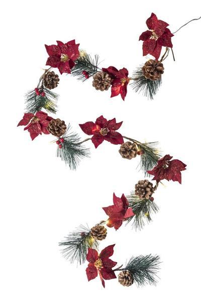 Perinteisin joulukukin, kävyin ja lehdin koristeltu upea köynnös pöytäkoristeeksi. Pituus 1,75 metriä. Led lämmin valkoinen, ei vaihdettava, paloikä n. 10 000h. Materiaali muovi. Johto kirkas. Muuntaja DC 31V 3,6W. Sisäkäyttöön.