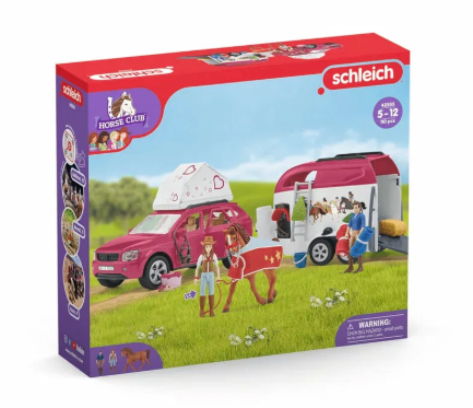 Hannah ja hänen isänsä kokevat upean seikkailun Schleich® HORSE CLUBin autolla ja hevosvaunulla! Monipuoliset toiminnot tarjoavat lukuisia leikkimismahdollisuuksia. Tilavan maastoauton istuimet voi kääntää, jolloin mieshahmo hra Kramer voi laittaa niihin paljon säilytettävää tavaraa, esimerkiksi taitettavan teltan sekä runsaasti ratsastusvälineitä, kuten kypärän, satulan, suitset, ämpärin ja puhdistustarvikelaatikon, joka sisältää hierontaharjan ja suan. Lisänä kiinnitettävät tikkaat. Hannah ei ole vain treenannut ahkerasti kilpailuja varten, vaan hän on harjoitellut holsteininhevostammansa kanssa myös irrotettavaan hevosvaunuun kulkemista. Luotettavan ja rauhallisen käyttäytymisen ansiosta hevonen antaa ohjata itseään luottavaisesti sisälle hevosvaunuun ja ulos. Jotta tamma voi hyvin kuljetuksen ajan, vaunuun laitetaan heinäverkko ja olkipaaleja. 5+.