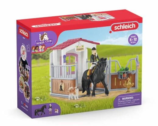 Schleich® HORSE CLUBin pakkaus ”Hevosboksi HORSE CLUB Tori & Princess” on toteutettu taidokkaasti. Ruusuke, kultamitali ja pokaali ovat todisteena täysin liikuteltavan tyttöhahmo Torin ja hänen upean friisiläishevostamma Princessin yhteisestä ratsastusmenestyksestä. Boksin seinät on koristeltu sievillä tarroilla, joihin voi kirjoittaa oman mielen mukaan. Katon voi irrottaa ja se toimii samalla myös erillisenä katoksena. Suitset, ohjat ja satula ovat valmiina seuraaviin treeneihin, niin kuin porkkanakin palkkioksi. Samalla kun tamma seisoo tyytyväisenä heinähäkin ja vesiastian luona, Torin hauska chihuahua Beauty kirmaa iloisena boksin ympäri. 5+.