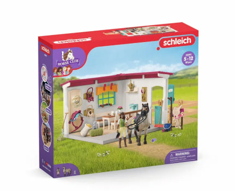 Schleich® HORSE CLUB -satulahuoneen varustelu on täydellinen: se sisältää kaikki tarpeelliset harjat ja suat, jotta voit harjata hevosesi heti kiiltäväksi. Se rakastaa erityishuomiota. Kaapista voit valita myös satulahuovan, jonka voit laittaa satulan alle. Yhteensopivat suitset roikkuvat tietysti myös seinällä. Satulahuoneessa on mukava viettää aikaa, eikö vain? Myös kissa ja koira ovat sitä mieltä. Ne ovat kumpikin innoissaan ja pitävät toisilleen seuraa harjauksen ajan. Mutta vain hevonen saa palkinnoksi omenan! 3+.
