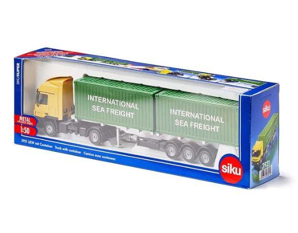 Yksityiskohtainen pienoismalli- lelu Mercedes rekka uniikilla konttipuoliperävaunulla. Tukeva ja vakaa metallirunko, toimivat kontin ovet, irrotettava puoliperävaunu, Säädettävä trailerin pituus: siihen mahtuu 1–2 konttia. Täydellinen lisäys muihin Siku- tuotteisiin. Mittakaava: 1:50, Materiaali: metalli/muovi, Mitat: 31.7 x 5.9 x 8.1 cm. 3+.