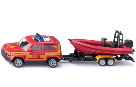 Land Rover Defender palokuntaversiossa on valmis vaativiin pelastustehtäviin missä tahansa maastossa – olipa kyseessä jyrkät vuoret, syvät rotkot tai epätasaiset polut. Metallirungon, kestävän muovialustan ja sporttisten kumirenkaiden ansiosta Defender selviytyy jokaisesta tiestä – puutarhassa, leikkipaikalla tai kokoelmassa. Hopeiset vanteet ja maalipinta antavat sille tunnistettavan ilmeen, ja läpinäkyvä kattoluukku paljastaa sisätilat. Ajovalot ja takavalot on toteutettu yksityiskohtaisesti, ja takana oleva vararengas korostaa valmiutta. Vakio-peräkoukun avulla Defender vetää mukana tulevaa muovista moottorivenettä metallirunkoisella perävaunulla määränpäähän. Maalla tai vedessä – mikään ei estä jännittäviä pelastusleikkejä tämän vaikuttavan leikkisetin kanssa! 3+.