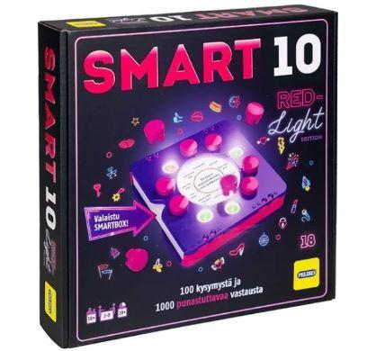 Erikoispainos Smart10 tietopelistä. Red light -versiossa on aikuisille suunnattuja, pikkutuhmiakin kysymyksiä sekä upea liilan ja pinkin värinen valaistu smartbox. Tuttuun Smart10-tyyliin kaikki pelaajat vastaavat vuorollaan kysymykseen. Jos vastaus on oikein, pelaaja saa vastausmerkin. Mutta kannattaako vastata vai passata? Jos vastausmerkkejä ei talleta ajoissa, voi jäädä pisteittä. Ensimmäisenä 20 pistettä kerännyt voittaa pelin.