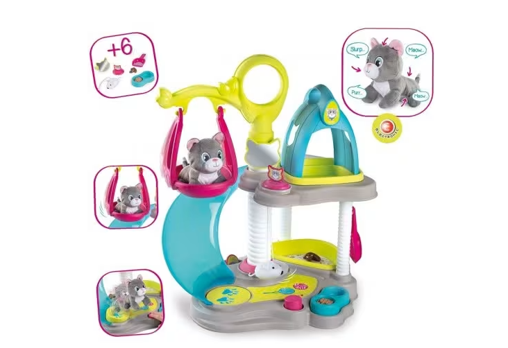 Pidä huolta ja hoivaa pientä kissanpentua kuin se olisi oikea! Toisin kuin oikea kissanpentu, tämä ei raavi eikä pure. Kissan omassa kodissa on liukumäki, ruokakuppi, leikkinurkkaus, keinu, peili ja tietenkin hiekkalaatikko tarpeille. Leikkisetti on helposti siirrettävissä kätevän kantokahvan avulla. Kissanpentu myös ääntelee ja kehrää saadessaan ruokaa.