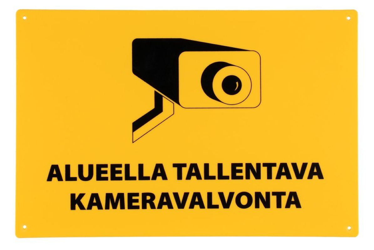 Muovinen varoituskyltti tekstillä “Alueella tallentava kameravalvonta”. Kyltissä lisäksi valvontakameran kuva. Kyltin kulmissa kiinnitysreiät. Keltainen pohjaväri.