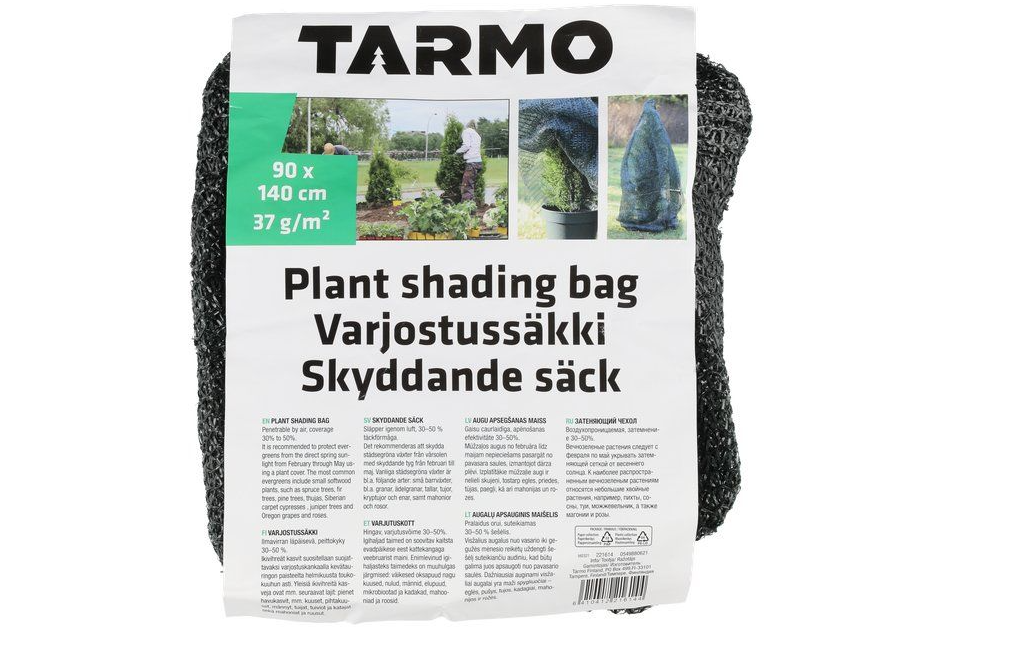 Varjostussäkki suojaa ikivihreät kasvit kevätauringon paahteelta. Ilmavirran läpäisevä, 30-50 % peittokyky. UV-takuusuojattu. 37 g/m².