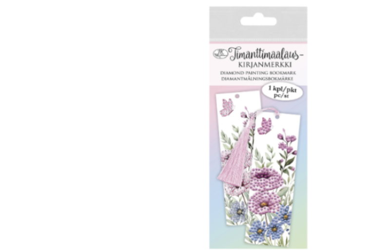 Timanttimaalauskirjanmerkki askarteluun ja koristeluun. Kiinnitä timantit työpohjaan ja luo upea timanttimaalauskirjanmerkki! Pakkauksessa on yksi kirjanmerkki, tasseli, vaha, timanttityökalu, astia timanteille ja timantit. Värit on lajiteltu omiin pusseihin numeroittain ja työpohjaan on myös merkitty kunkin värin paikka. Pakkauksen takana on tarkemmat ohjeet timanttimaalauksen askarteluun.