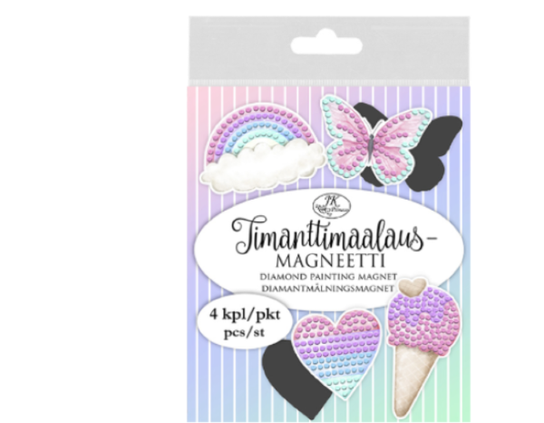 Timanttimaalausmagneetti askarteluun ja koristeluun. Kiinnitä timantit työpohjaan ja luo upea timanttimaalausmagneetti! Pakkauksessa on neljä erilaista kuviota, joissa on magneetti takana sekä mukana myös vaha, timanttityökalu, astia timanteille ja timantit. Värit on lajiteltu omiin pusseihin numeroittain ja työpohjaan on myös merkitty kunkin värin paikka. Pakkauksen takana on tarkemmat ohjeet timanttimaalausmagneetin askarteluun.
