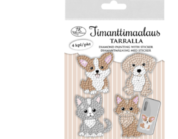 Timanttimaalaustarra askarteluun ja koristeluun. Kiinnitä timantit työpohjaan ja luo upea timanttimaalaus! Pakkauksessa on neljä erilaista kuviota, joissa on tarrakiinnitys takana sekä mukana myös vaha, timanttityökalu, astia timanteille ja timantit. Värit on lajiteltu omiin pusseihin numeroittain ja työpohjaan on myös merkitty kunkin värin paikka. Pakkauksen takana on tarkemmat ohjeet timanttimaalauksen askarteluun.