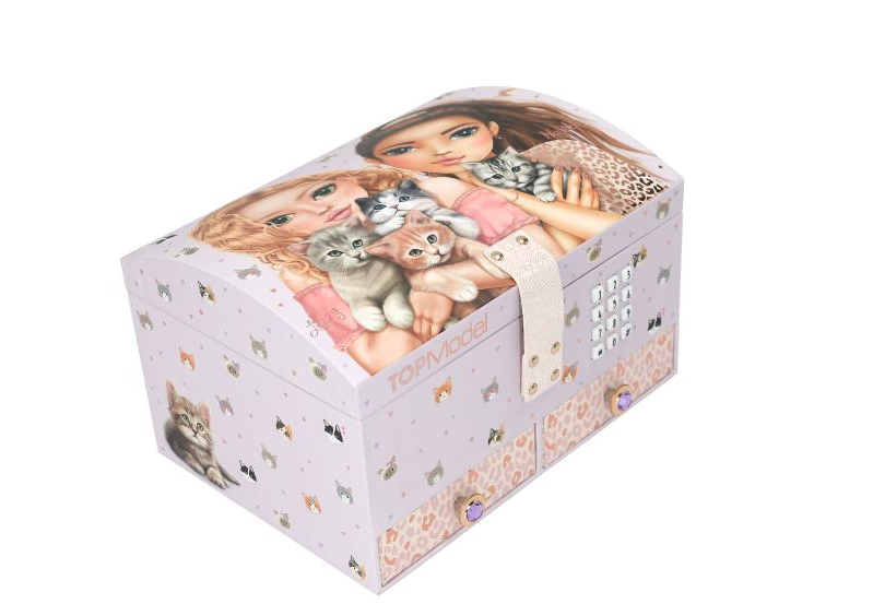 Pienille aarteille ja salaisuuksille: TOPModelin suloinen pieni korurasia avautuu vain, kun oikea koodi syötetään (koodia voi personoida ja muuttaa). Tämän jälkeen huippuhitti Shivers soi noin 20 sekuntia. Korurasian sisällä on irrotettava sisäosa, jossa on kolme lokeroa ja peili. Ulkopuolella on kaksi lisälaatikkoa, joissa on korukivinappi. Ruusunvärisessä korurasiassa on suuri kaksoismalliaihe, jossa on kissanpentu saranallisessa kannessa, ja paljon söpöjä kissan naamoja, leijonanjälkiä, tassunjälkiä ja sydämiä ympärillä ja sisällä. Paristot sisältyvät pakkaukseen ja ovat vaihdettavissa.