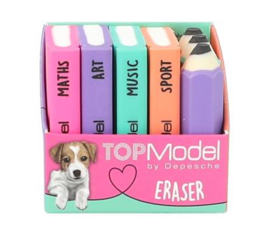 Hauska TOPModel-pyyhekumisetti, jossa mukana neljä suloista oppikirjapyyhekumia ja kolme värikästä kynäpyyhekumia.