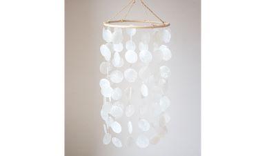 Tuulikello hennoilla simpunkankuorikoristeilla, valkoinen helmiäinen, Ø28cm, korkeus 75cm