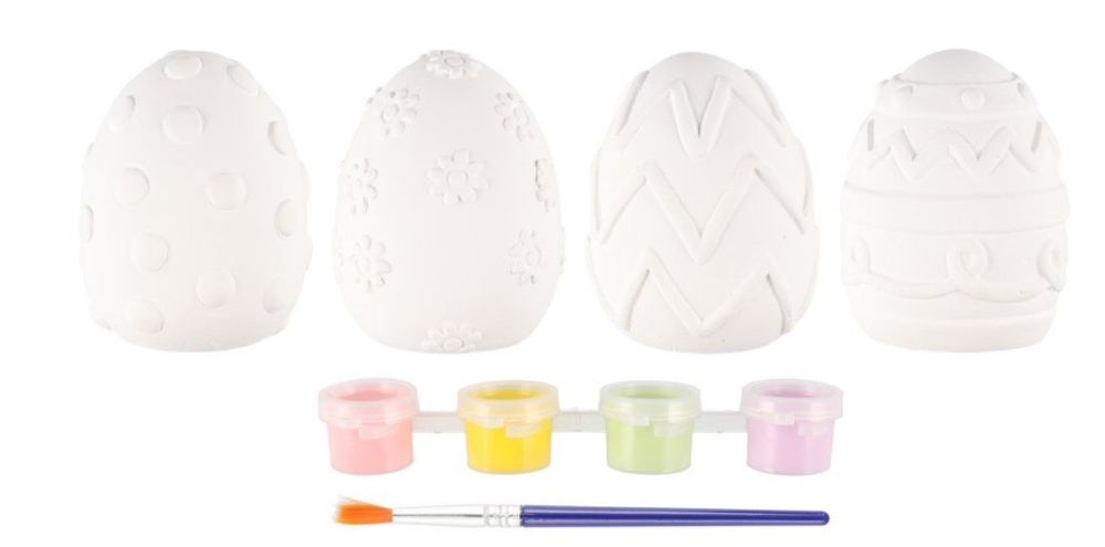Tee jokaisesta munasta uniikki! Setti sisältää kolme kohokuvioitua valkoista kipsimunaa, neljä eriväristä maalia ja siveltimen, joiden avulla voit luoda oman tyylisen koristeesi.