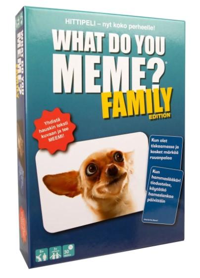 Suositun What Do You Meme? -pelin koko perheelle sopiva versio. Pelin tavoitteena on löytää hauskin kuvateksti aina esitetylle kuvalle. Hauskin ja osuvin voittaa kierroksen ja kerää pisteet. Sisältää 64 kuvakorttia ja 300 suomenkielistä tekstikorttia, jotka sopivat sisällöltään myös nuoremmille pelaajille. Peli sopii yli 8-vuotiaille. Pelin kesto on n. 30-90 min, ja se sopii kolmelle tai useammalle pelaajalle. Rentoihin ja hulvattoman hauskoihin hetkiin!