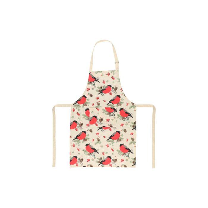 Punatulkkukuvioinen esiliina säädettävällä kaulanauhalla. Mitat 60 x 85 cm. Materiaali 100 % puuvilla. Vesipesu 40 astetta. Tuotteella on Ökotex-sertifikaatti, mikä tarkoittaa että tuote on turvallinen eikä se sisällä haitallisia kemikaaleja. Kuosi design Anna Säteri.