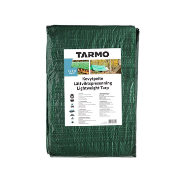 Vahvat alumiiniset kiinnitysrenkaat, metrin välein. Vahvistettu langoin. Muoviset kulmavahvisteet. Koko: 3 x 5 m. 80 – 90 g/m². UV-suojattu.