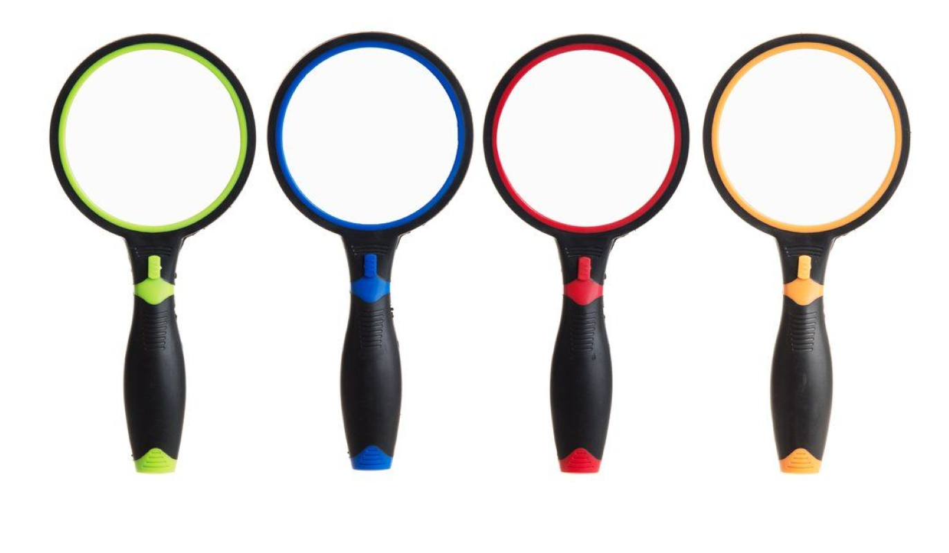 Suurentaa nelinkertaiseksi. Paksu kädensija antaa hyvän otteen. LED-valo. Paristot 3 x LR44 (sisältyy).